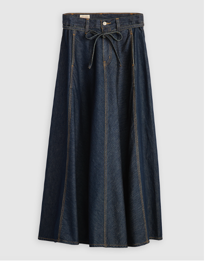 The XL Culotte provides a modern twist with its cropped, wide-leg silhouette, perfect for styling with boots or sneakers. Featuring a removable self-belt and crafted from non-stretch, soft denim, its transitions effortlessly across seasons. The new XL Skirt introduces a striking full-length option, with panels that add extra drape and volume. This trend-forward silhouette elevates denim dressing to new heights, making a refined yet dramatic statement.